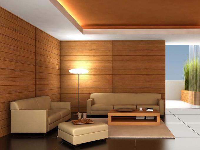 ছবির বসার ঘরটি কাঠের নকশা ল্যামিনেটেড পিভিসি প্যানেলের সাথে সজ্জিত, এটি কাঠের মতো দেখতে লাগে, কিন্তু কাঠের তুলনায় খরচটি অনেক সহজ এবং ইনস্টল করা সহজ। এটি পরিষ্কার করা সহজ।